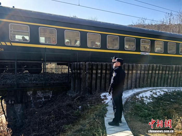 图为西安铁道公安处秦岭站派出所平易近警护航路过列车平安止驶。王小东 摄